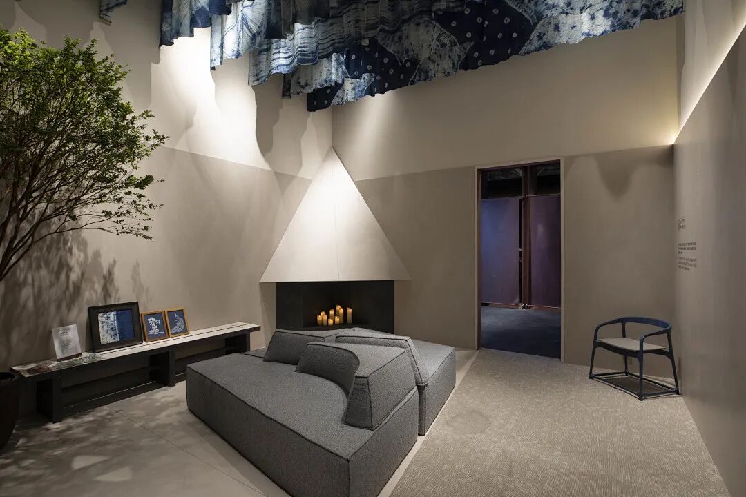 每个主题空间中,皆融入了蕴含东方意境的艺术装置:白茶空间内,扎染布匹轻盈悬垂;绿茶空间中,
